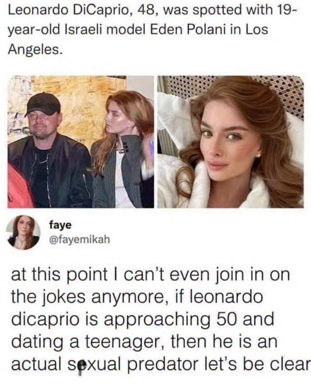 >>218593960>Leo gets shit on for doing thisby who? Twitter and journalists? tabloid celebrity 'scandals' used to be drink driving or having a heroin habit, not dating an adult woman.hell, how many classic love stories are about a middle-aged man dating a 20-year-old, or even a teenager? in real life, women love that shit, they don't performatively pretend it's icky and wrong.