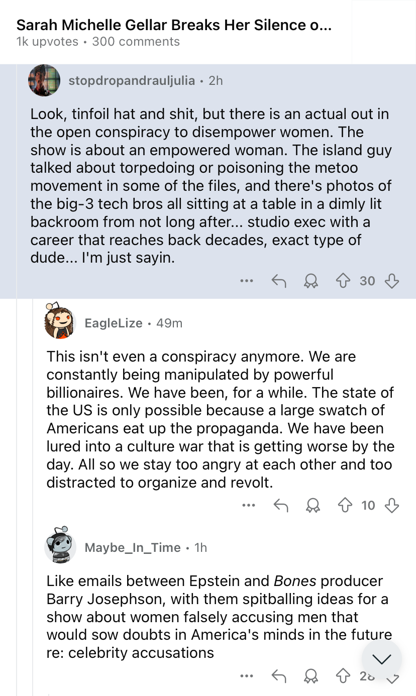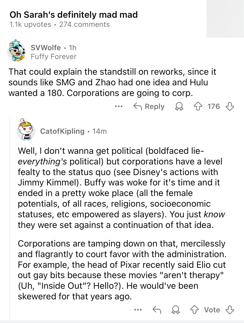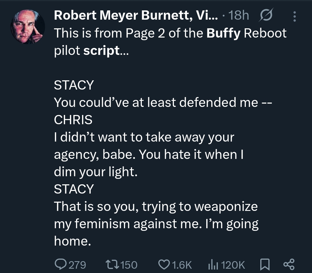I had doubts about it being good, but the leaked script (which by all accounts is not what they shot) being middling or shitty doesn't discount anything she says. Even the actual finished pilot being shit means nothing. Hulu has produced far worse. All this board of degenerate masturbators does is gargle semen and call things slop. When has something being shit ever stopped them? A Buffy sequel had guaranteed eyeballs, whether it was good or not. Gellar has (almost) always been pretty conservative with PR, so I doubt she's talking out of her ass even if she is angry. I can believe there might be more to this than she's letting on (like creative discord about the trajectory or mission of the show, or budget) but I highly doubt this executive is a savvy tastemaker rescuing the brand. It's fucking Hulu. They made Alien: Earth.