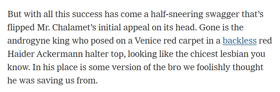 >>218620644His fanbase is entirely made up of libtard women and libtard gays who still take Hollywood critics at face value. They're the ones who care. They viewed timmy as a quiet introspective mysterious twink frenchman artiste- his borderline chud adjacent image he has now is like a stab in the heart to libtard women and fags all over the world. That was his core fanbase.