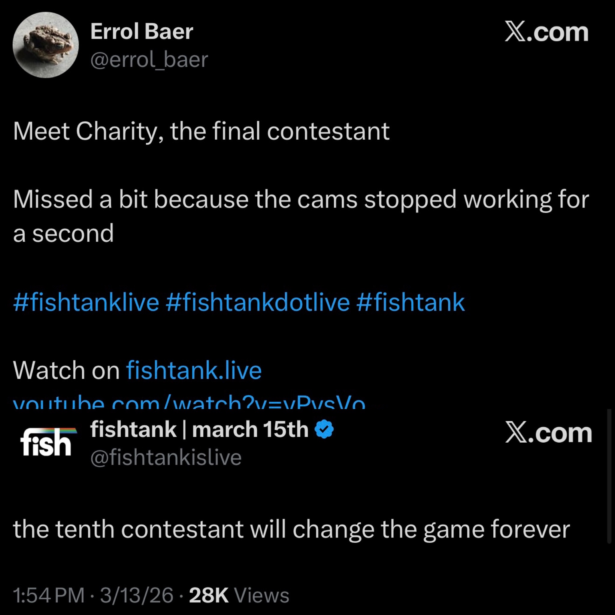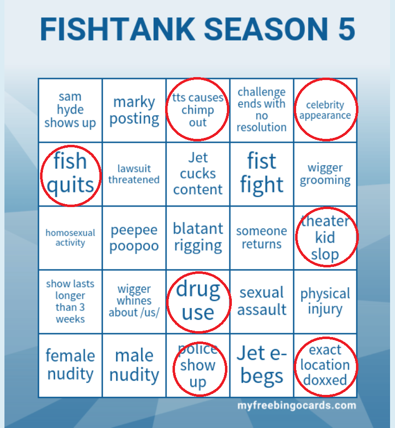 >/ftl/ NEWS-- Bezo is GONE because his family got doxxed-- You can now watch the handheld cam whenever you want if you have XL season pass! -- Bam said there's an arcade room, a jungle room, a karate room, and a "goo room"... https://x.com/thedesign59/status/2033656077460337148-- The house was SWATTED on Monday afternoon...-- Season 3 episode 2: https://gofile.io/d/mGLrB6-- An Indian woman named Antara is now monitoring the house via the robot! -- First elim is WEDNESDAY not Thursday. Top STOX chooses who goes home!>Links:https://fishtank.rip/https://old.ppv.to/fthttps://www.fishtank.live/https://x.com/fishtankislivehttps://classic.fishtank.live/https://www.instagram.com/fishtank.live/https://fishtanklive.fandom.com/wiki/Season_5https://www.youtube.com/@fishtankislive/videosDon't split threads, new bakes happen at 140 images, new baker is only needed if image limit is hit (150). Don't post in early threads. Kiwifarms faggots spam threads with irrelevant thumbnails to get us banned from /tv/Previous: >>218619472 >>218619457