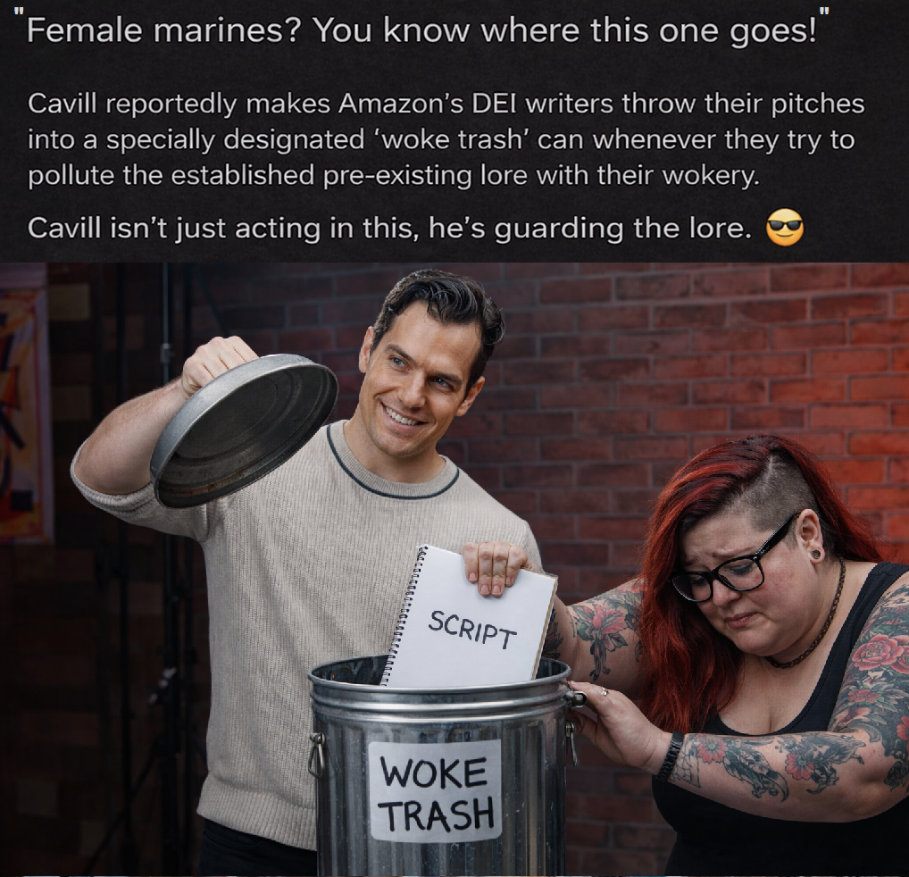I just learned from a well-placed source that Cavill shows up to the writing sessions completely naked with his huge girthy 10 inch cock flopping in the faces of the seething blue-haired DEI hires.