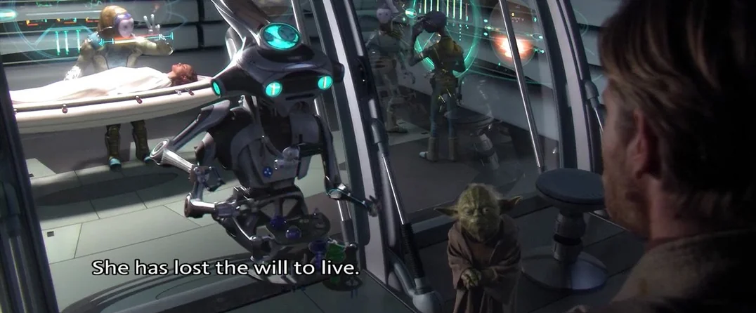 She felt Anakin's BWC turn into a small black pecker through the force and she lost the will to live.