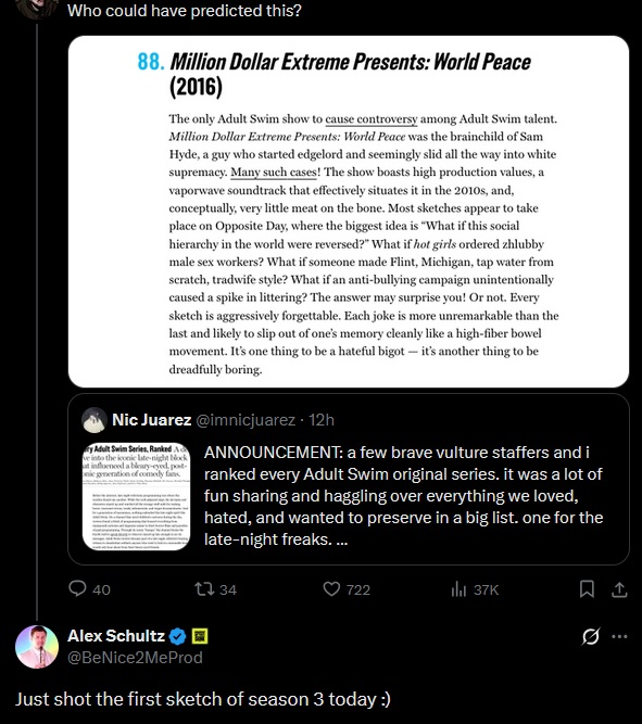 >>218694971>>218694995>trust us guys we gonna get it right this time we promise MDE NEVER DIES.Fuck Alex Schultz hes a hack. “HAHAHAHA LOOK AT ME IM VANILLA NIGGA IM SO FUNNY CAUSE I SAY NIGGA” dude perma stuck on 2020 comedy
