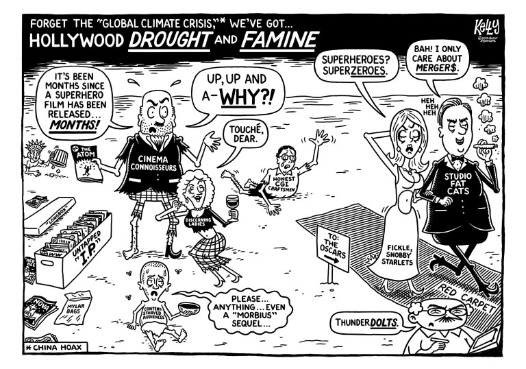 >>218702498Kelly is a character who airs his grievances about various insignificant inconveniences in his comics, he's bitched about his specific local supermarket, his ex-wife, his in-laws, etc, using the strip before. The joke here is that he's a lame boomer who misses his superhero slop, and to a lesser degree the absurdity of him complaining it's been too long (because they put tons of them out) or that Hollywood is dismissive of the genre (they shove it down our throats). One of the 'character development' installments of the overall comic.