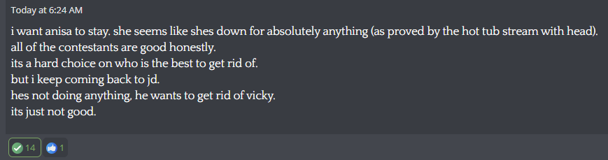 They can't kick Anissa because she's literally the only person keeping Head interested in the tankIf Anissa is gone Head doesn't give a fuck and becomes nontentThen you have JD, James, Bashir and now Head being nontent lumps taking up space until the next eliminationBest move would be to kick JD, nobody likes him same with Bashir and Vicky but unlike them he is legit nontent