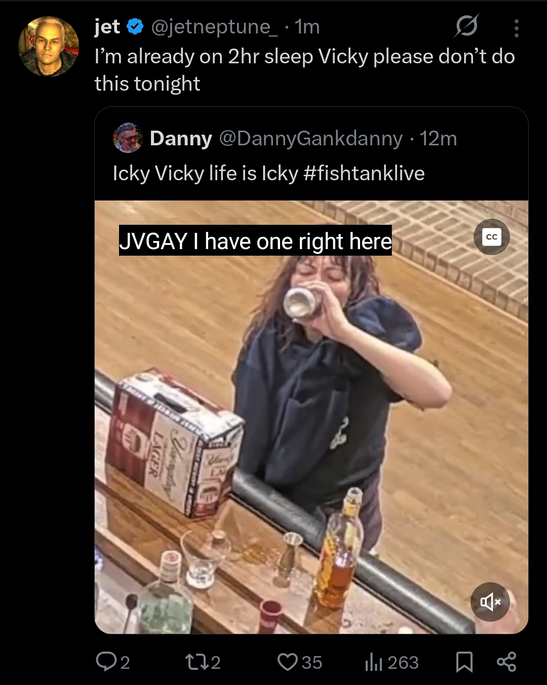 >TTS comes through saying whoever takes a shot of fireball and shotguns a beer gets a letter>Vicky IMMEDIATELY does both