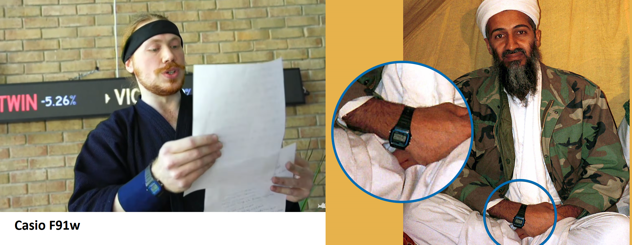 The watch bashir/mohamed is wearing is a casio F91w. It was popular among the taliban, it was heavily used to make IEDs. Bin Laden wore one too, you can check his pictures.
