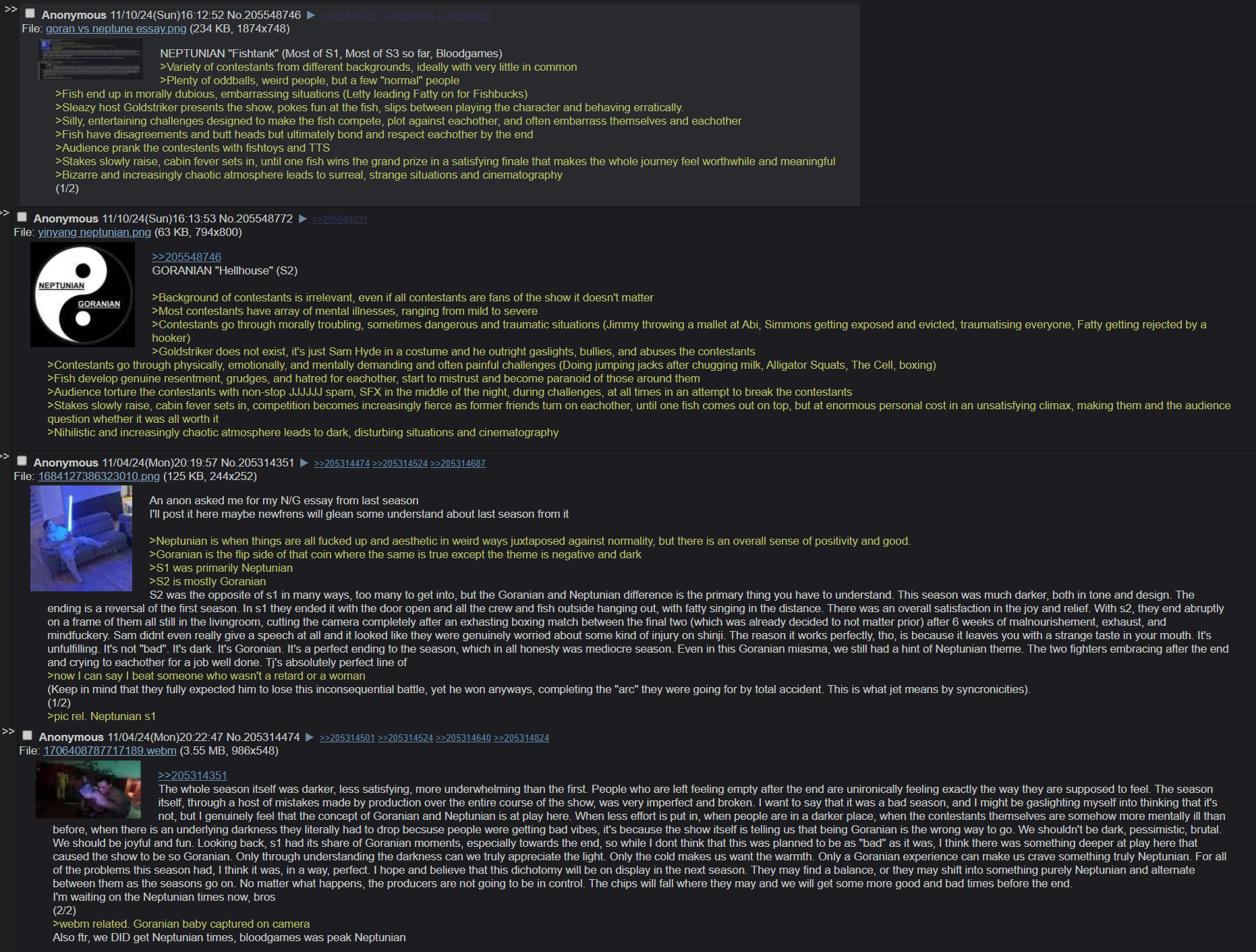 >/ftl/ seething because le heckin quirk chungus who wears costumes and prays is eliminated>oh no who will wear karate gis and talk about purity and do literally nothing else ever and be the most nontent in 5 seasons of fishtank now?!?!??