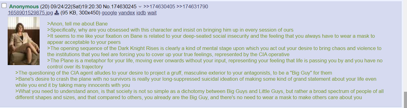 >>218825478>these guys are irredeemable--something Milfy realizes by the end. As an audience stand-in, her realization is supposed to echo our ownShe read a study that said what Richard and Elliot already told her years earlier, so it wasn't a genuine realization. By S6 she knew Tony was untreatable, she just developed a weird emotional dependence on Tony, especially after Employee of the Month. The reason she had to drop Tony was because Elliot outed her patient to her whole social circle, so she used that study to cope instead of admitting she violated professional ethics for years. She was just avoiding accountability just like she does throughout the show.