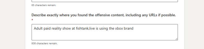 >>218831544updated here's the url btwhttps://support.xbox.com/en-US/forms/report-a-safety-concern