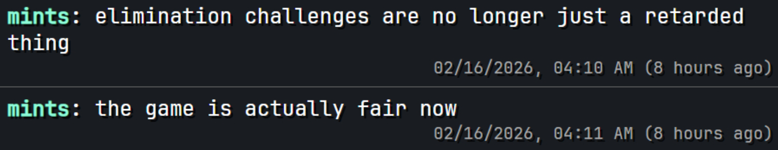 >Guys the fish have to be allowed to eliminate other fish there is literally no other way>other then being an obnoxious piece of shit and getting them to leave but that would be too interesting so it has to be through really shallow poorly thought out challenges.