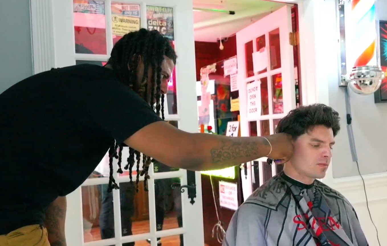 barber leaning away from him while he cuts