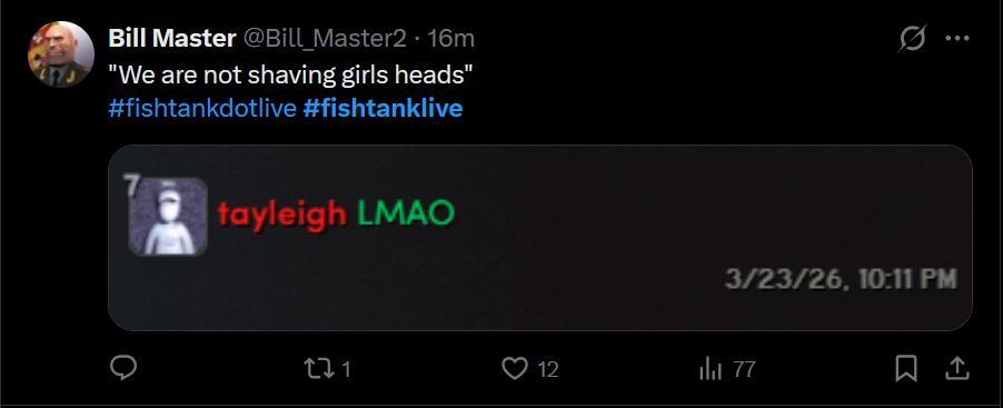 Asking the fish for help edition>/ftl/ NEWS:-- One fish's limbs will be "amputated" every 12 hours...-- The wiggers have taken the food from the refrigerator because no one's buying shit from the market... the fish tried to resist to no avail... https://x.com/thedesign59/status/2036244753826595047-- Bingo is losing too much weight so Jet is making her eat baby food...-- Landon might have scurvy... https://x.com/UnevenEyebrow/status/2036207553982403031-- Klaus and Benleaks: stop trying to bake threads on /tv/! https://i.4cdn.org/wsg/1774250232374973.webm-- Elimination on Wednesday, typing challenge, winner gets bullet-- EnSlave job opened, fish can earn money by completing mini games, puzzles, moderating chat rooms and more.-- The wiggers have asked Antara to come to Atlanta in person-- Jet is doing a bit where he's trying to make the twins believe he's an alien https://x.com/jetneptune_/status/2036019274230182188>Links:https://fishtank.rip/https://www.fishtank.livehttps://kick.com/fishtankhttps://classic.fishtank.livehttps://x.com/fishtankislivehttps://old.reddit.com/r/fishtanklive/https://www.instagram.com/fishtank.live/https://www.youtube.com/@fishtankislivehttps://fishtanklive.fandom.com/wiki/Season_5NEVER reply to early threads! Let them DIE. Only use threads made at the RIGHT time!>>218869748