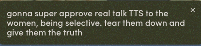 You could've waited 1-2 days and rigged it for anissa to leave you fucking retard, without making her clam up. Instead you're literally coaching her in what to do, which after her getting mega nuked shittalked by the TTS, will make her be more on her head, Anisa is completely ruined by your retarded incompetence, gj jet. Everything is, was, will always be your fault