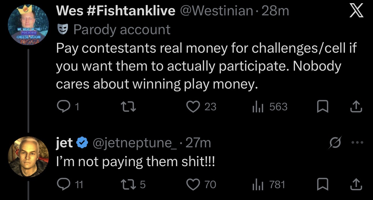 The hammock edition-- James Drake manhandled Emma and tossed her out the cell, Emma seen GIGGLING and SMILING. CaptainChunk cannot be reached at this moment.-- Anissa ate a log of SHIT meant for Beth-- THE CELL has begun! Jet said it's gonna get "gross"...-- New freeloader Beth is here... she's a streamstars orbiter and an ONLYFANS girl.. https://www.tiktok.com/@vampireliquor-- Beth was on Torture Chamber, a scuffed Fishtank ripoff...-- Vicky is ALIVE and posting on insta... https://www.instagram.com/p/DWSM4raAGtX/-- RYAN DUNN TTS got through to Bam... https://x.com/HeartTank64/status/2036544400059408503-- Computer room is OVER because the fans kept saying things they shouldn't have...-- Bashir MANHANDLED Mints... https://x.com/kingdoctor_/status/2036552898218217919-- Elimination on Wednesday, typing challenge, winner gets bullet-- Benleaks, stop baking dogshit threads! https://i.4cdn.org/wsg/1774250232374973.webm>Links:https://fishtank.rip/https://www.fishtank.livehttps://kick.com/fishtankhttps://classic.fishtank.livehttps://x.com/fishtankislivehttps://old.reddit.com/r/fishtanklive/https://www.instagram.com/fishtank.live/https://www.youtube.com/@fishtankislivehttps://fishtanklive.fandom.com/wiki/Season_5>>218915419