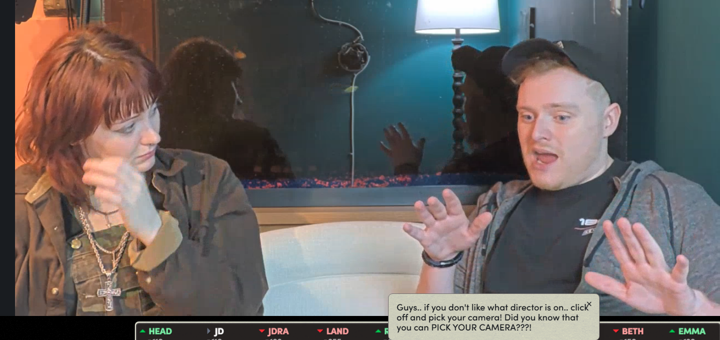 >>218919056But then you can't control the camerasIf I am stuck watching one camera it may as well just be the kick camera. I watched one of the restreams and the guy would constantly switch to empty rooms for no reason or change the angle and then the camera would go off for 10 seconds missing everything.
