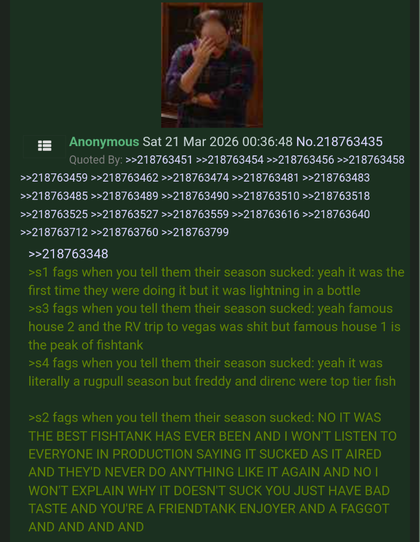 >>218932592>famous house 2 sucks>famous house 1 was good let alone peakSeason 3 fans have the worst taste holy shit. Practically the only screenshots you ever see posted from S3 anymore are from famous house 2 and usually of the famous house 2 cast