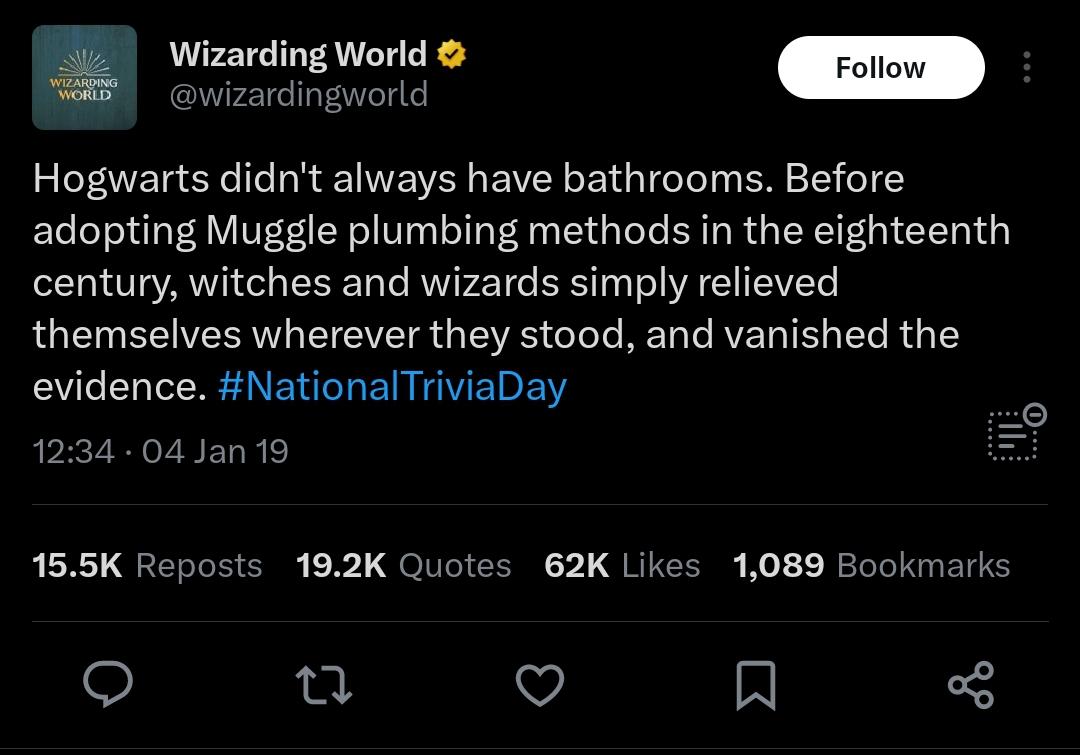 >>218939559Any revival of the series should try to fix the gaping holes in the logic of the potterverse. Magic needs to have certain rules and limits so that it makes a bit of fucking sense.