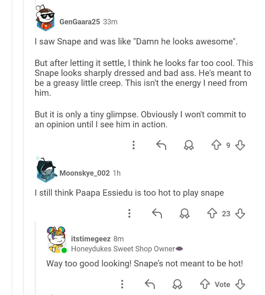 >>218964524My God.. I really thought it was a troll... They actually made Snape that dreadlocked negro... Kek