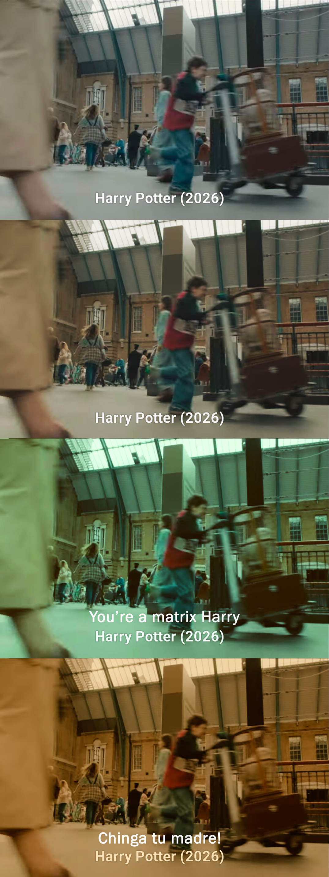 >>218967979>The original was filmed on a movie set they made in Elstree to look like Kings Cross station in London. Its not real and the "brick work" is cladding stuck on wood to make it look like real bricks.cladding fades in a few months when exposed to the elements to look more like the natural colours of bricks, but before then it has pretty vibrant colours, like a cheep red tshirt before its first wash.Everything is filmed in a very neutral and washed out format with 2000 gorillion gigabytes, you pull out the colors you want in post production. You literally have to or it will look grey. Ofc I can't make it look nice because it's already graded and low res and I have no raw color data captured by the camera.