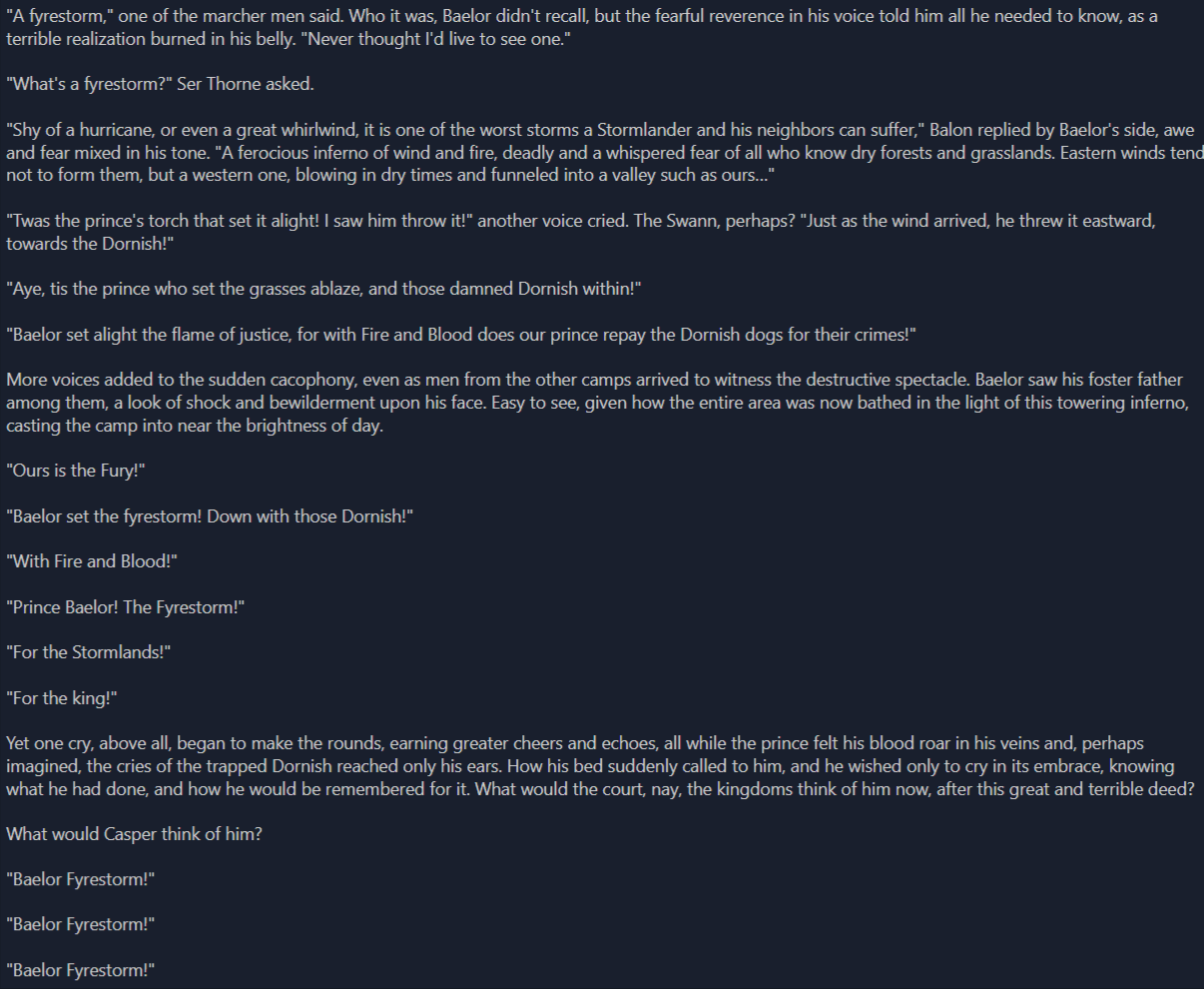 Mad King sitting there like “burn them all” while half the court is like and we’re supposed to believe nobody tried to just… not do that? It’s one of those historical blurbs where you can feel George leaving room to retcon later when he changes his mind in 2043.