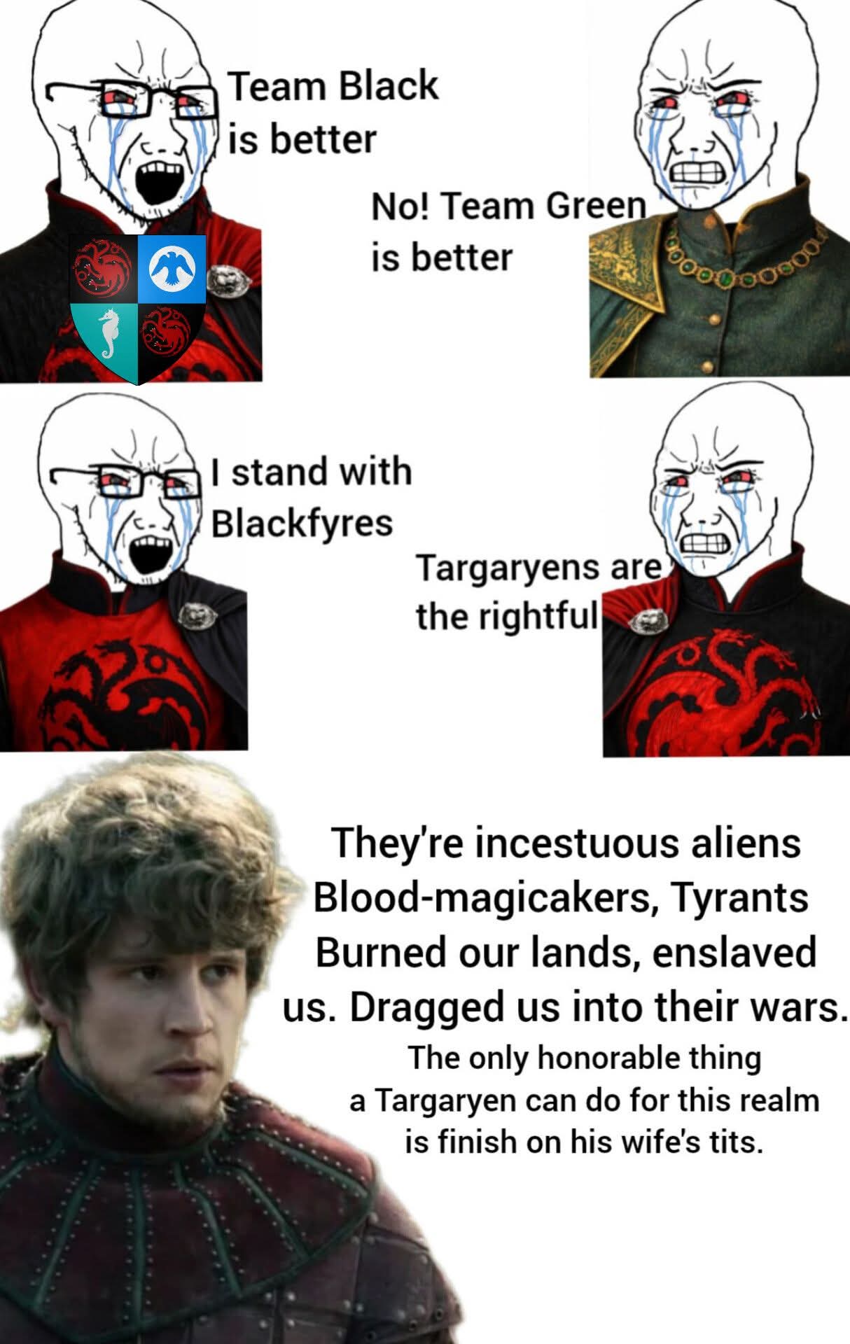 Denied fighting against his brother, mogged by Queen Regent Alyssa, Jaehaerys and then Rhaena