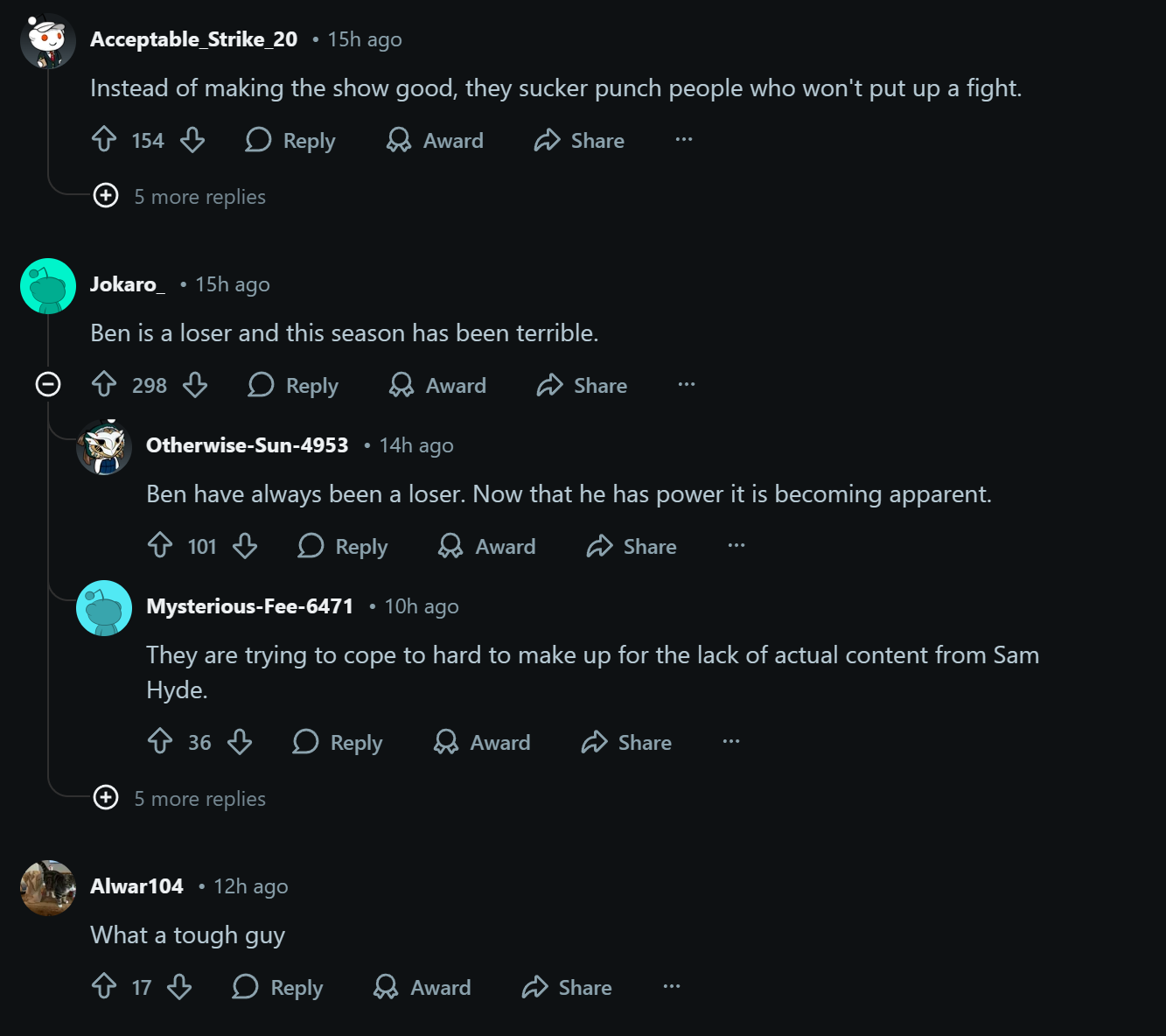 despite the roid rage sam actually cared for the contestants in each season, jet and ben actively hate them and the audience and are sperging out every day. not a good look!