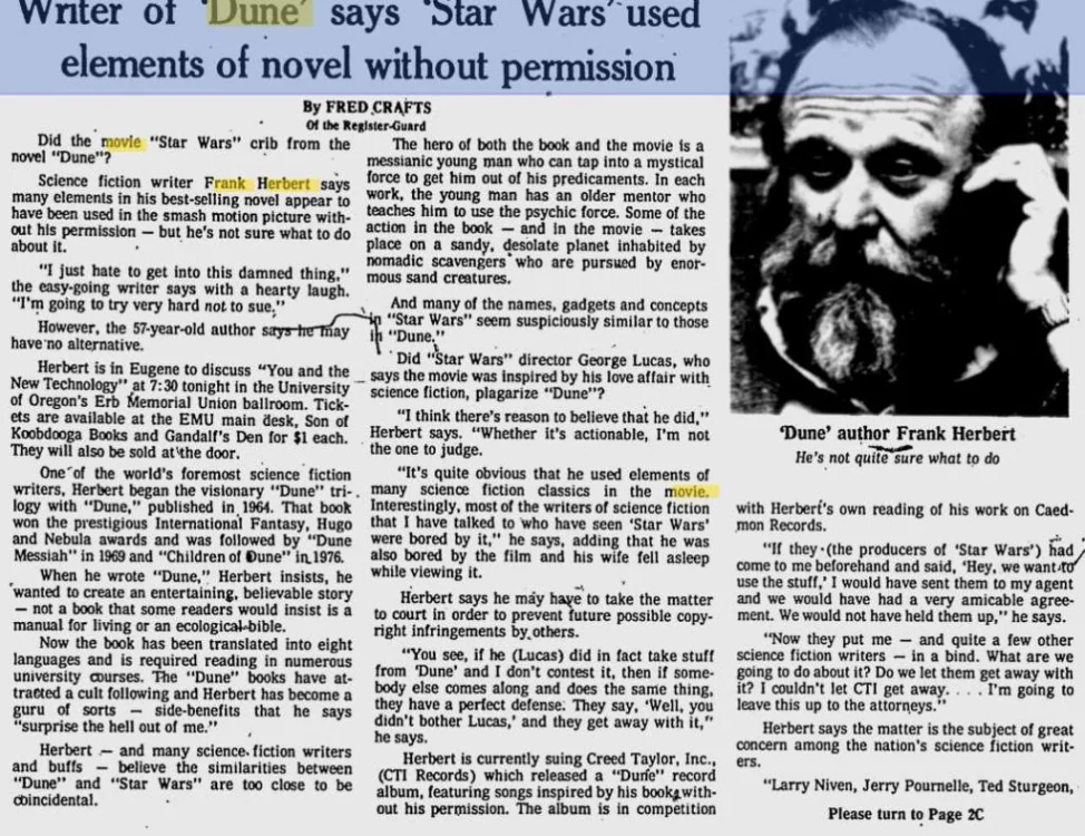 Frank Herbert, the creator of Dune, said that Star Wars ripped off Dune.Was he right? If he was right, why didnt he sue George Lucas? If someone made an insane amount of money ripping off of something I created, I would had sued for sure.