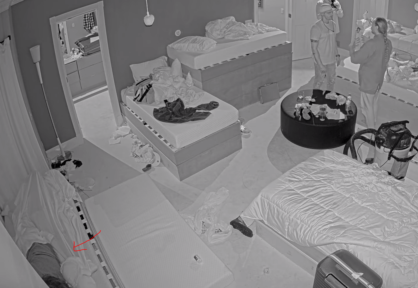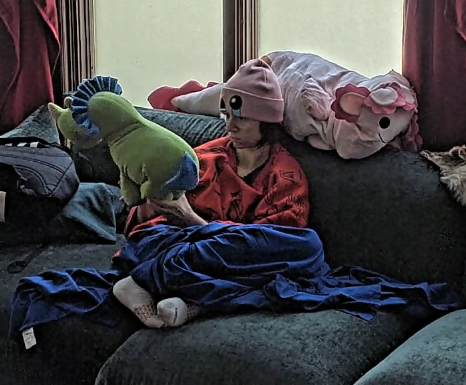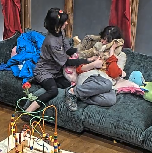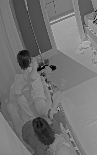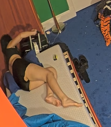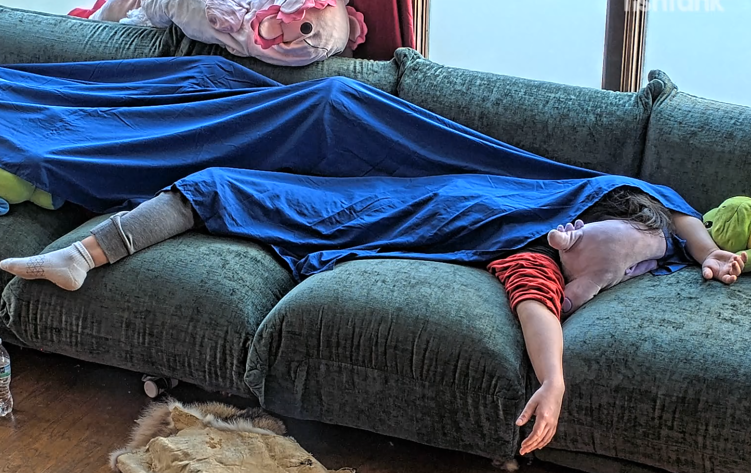 >>219035303Sleeping in the bed with her sister. She’s the head poking out on the bed on the floor.
