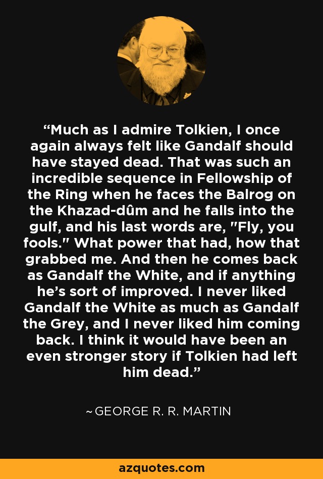 Look their budget wasn't infinite ok? You had to cut some things. What I can't forgive though is how much shit they added like Frodo and Sam going to Osgiliath. >>219048594GRRM does all the same things but 10x worse because he has countless fake deaths and characters coming back to life.