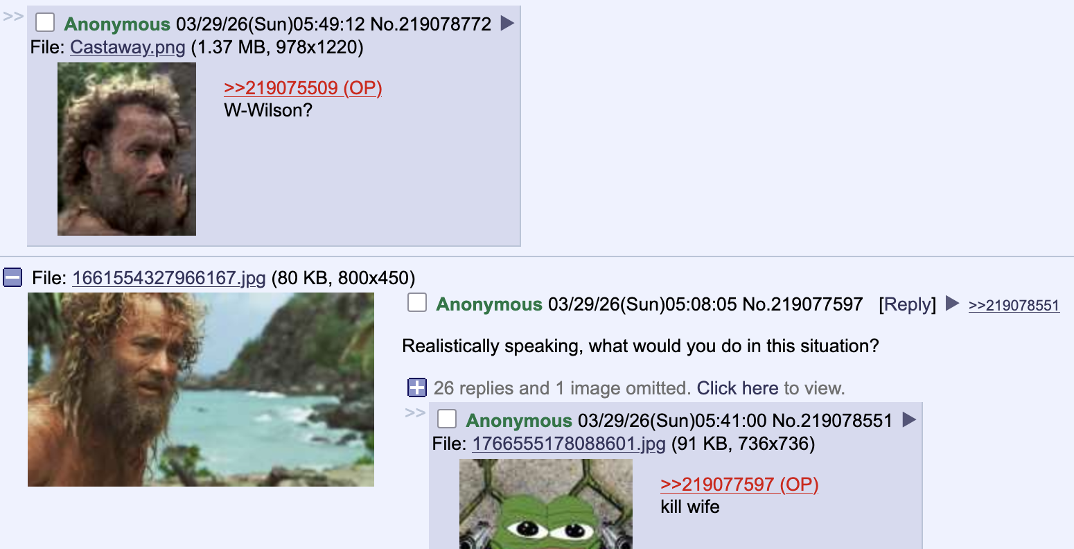 >>219077597Realistically speaking? Probably panic and die. That said, Cast Away was peak comfy.