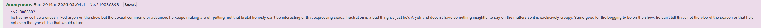 >>219090329Idk what that is and never watched it. My favorite contestant, Emma, also never watched it.
