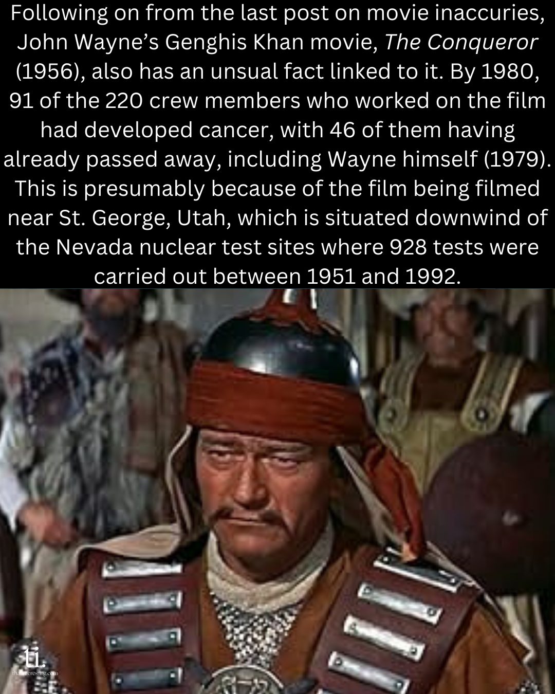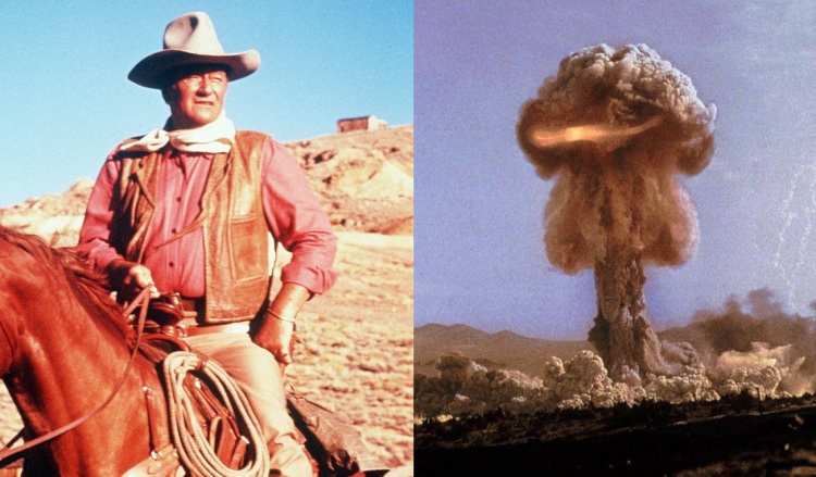 The Conqueror (1956) starring John Wayne as Genghis Khan, was produced near a nuclear testing site in Nevada. Radiation exposure on the set is believed to have caused the cancer-related deaths of many of the cast members, including John Wayne