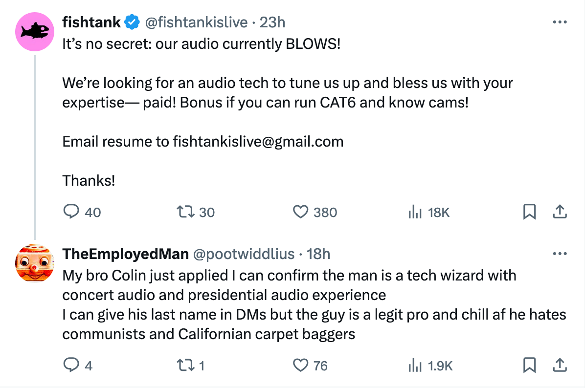 When will Jet learn that minimal prompting and letting the fish do their own thing is 100x more interesting than his shitty scripts and concepts