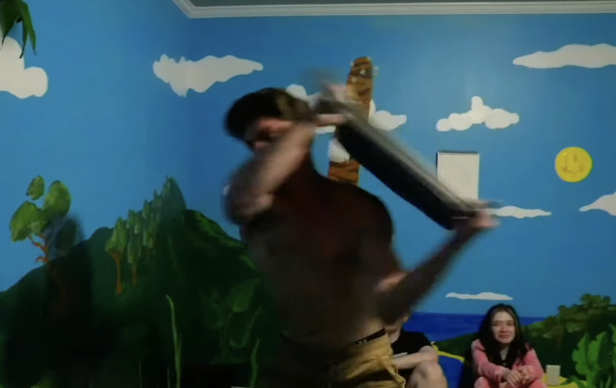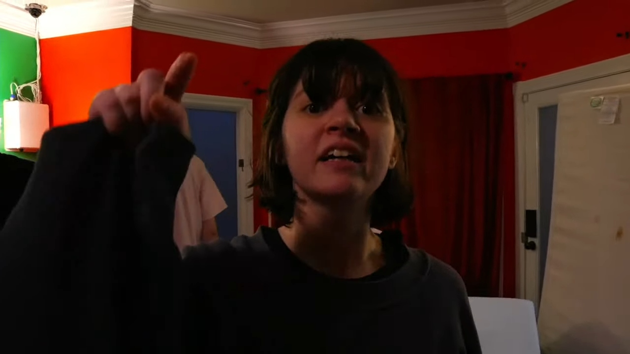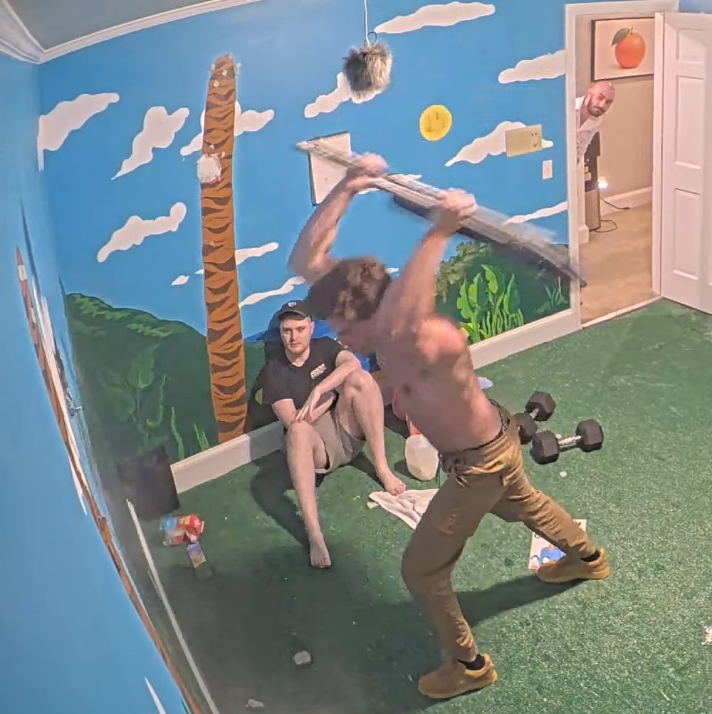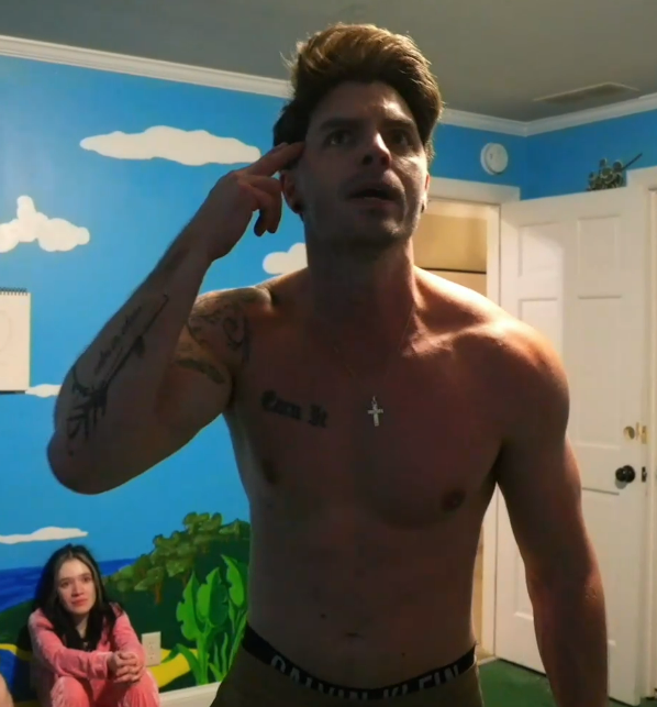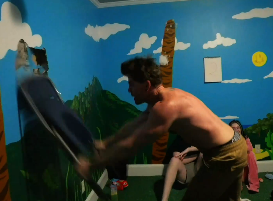 >JD yelling at Emma as she laugh-cries while Drake angrily pumps iron in the corner