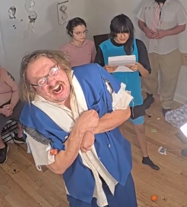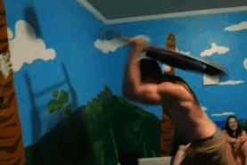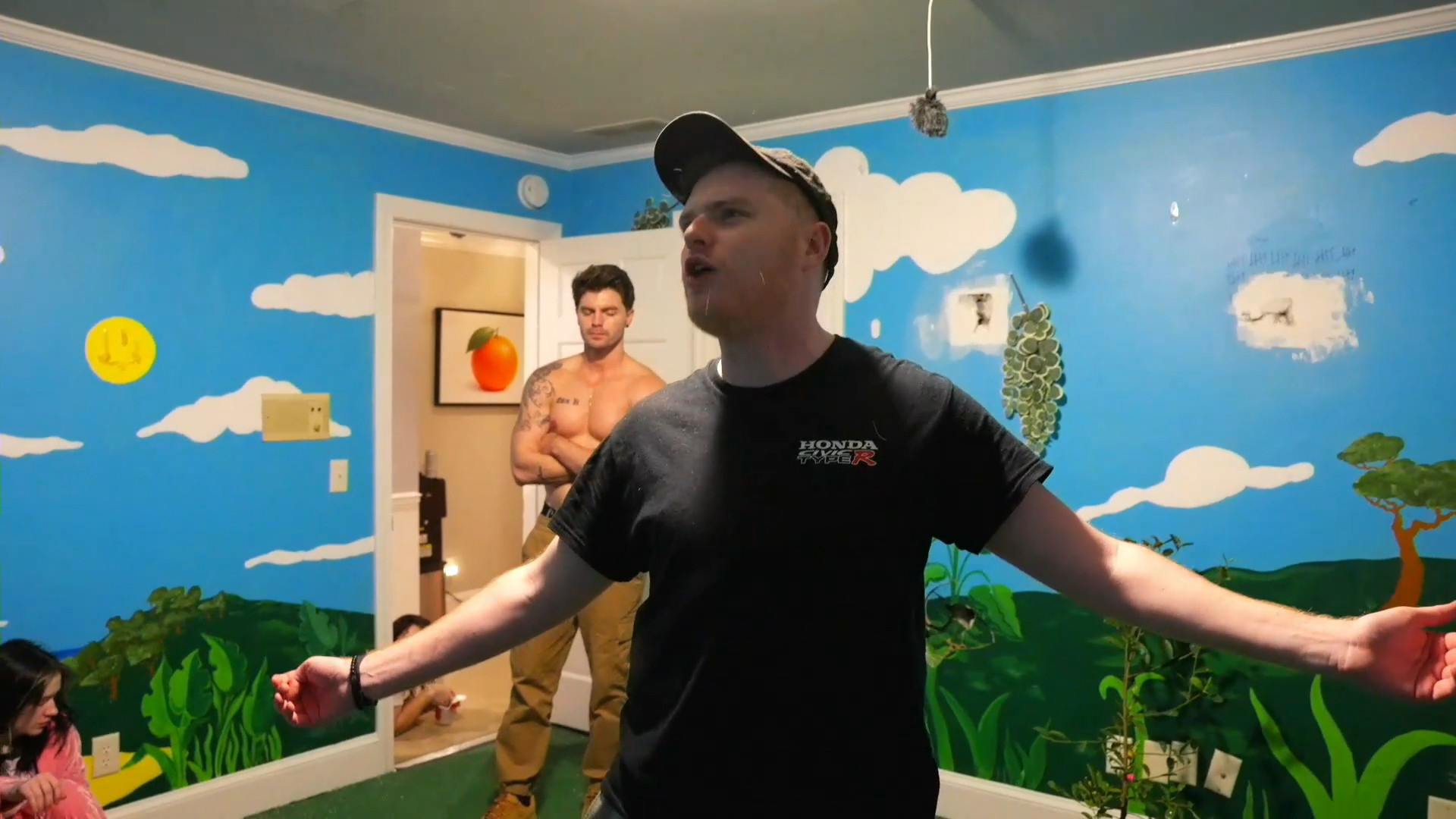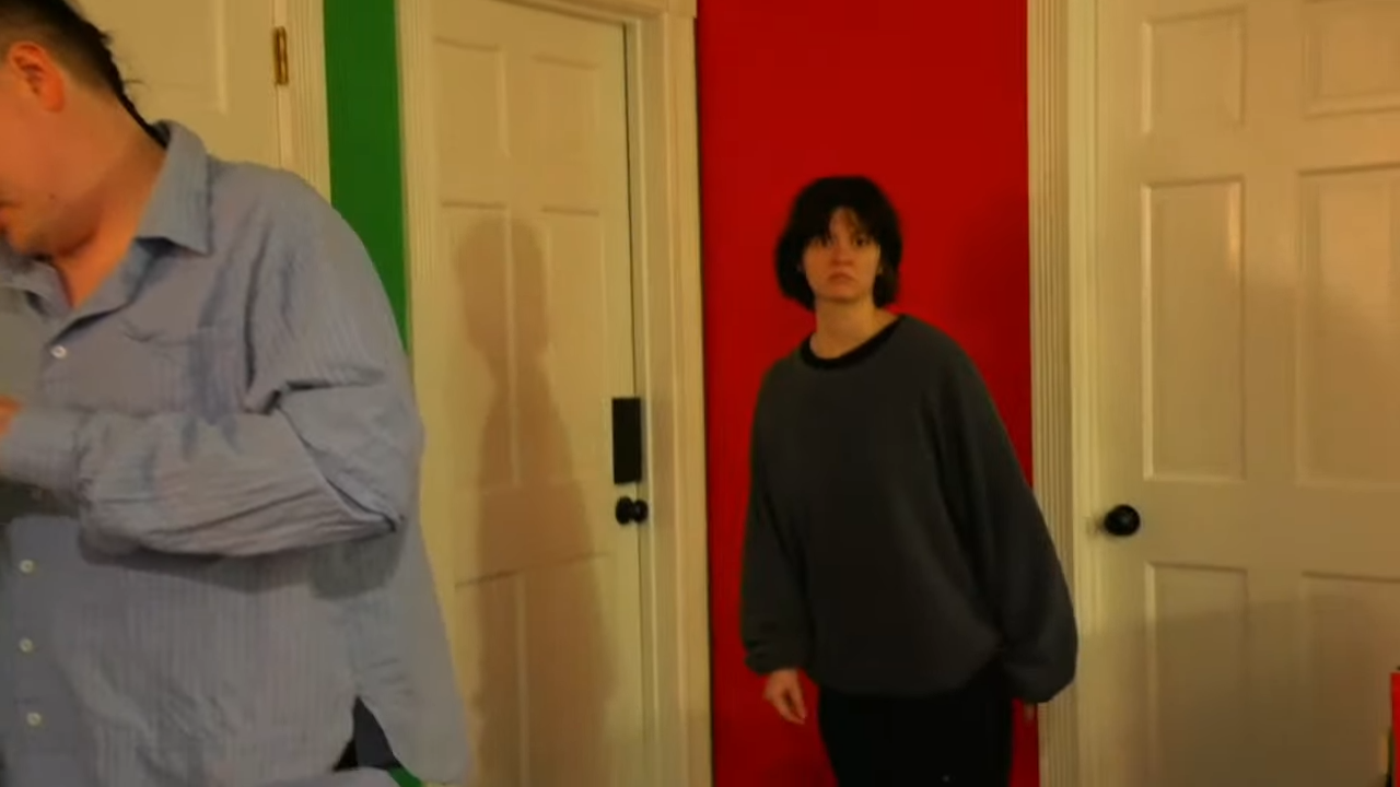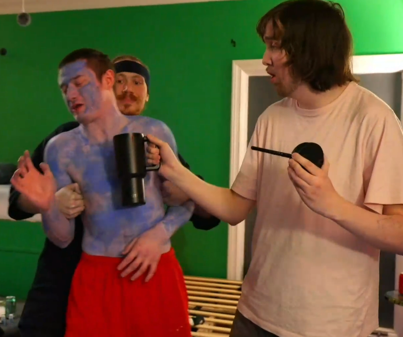 >JD yelling at Emma as she laugh-cries while Drake angrily pumps iron in the corner