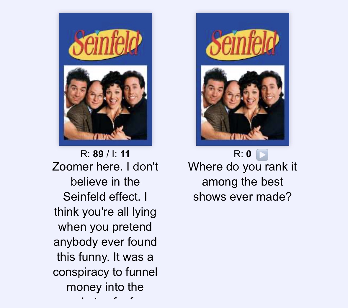 Calling it a direct rip off is obviously rage baiting. It's a completely original show that was influenced by Seinfeld. "It's like Seinfield on crack!" was the tag line they created you're not clever.