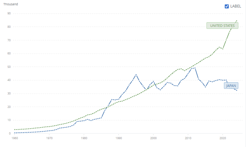two opposites. because of all the unions, producing anything in the US costs a lot of money. meanwhile, the japanese get paid in peanuts to be overworked to death.