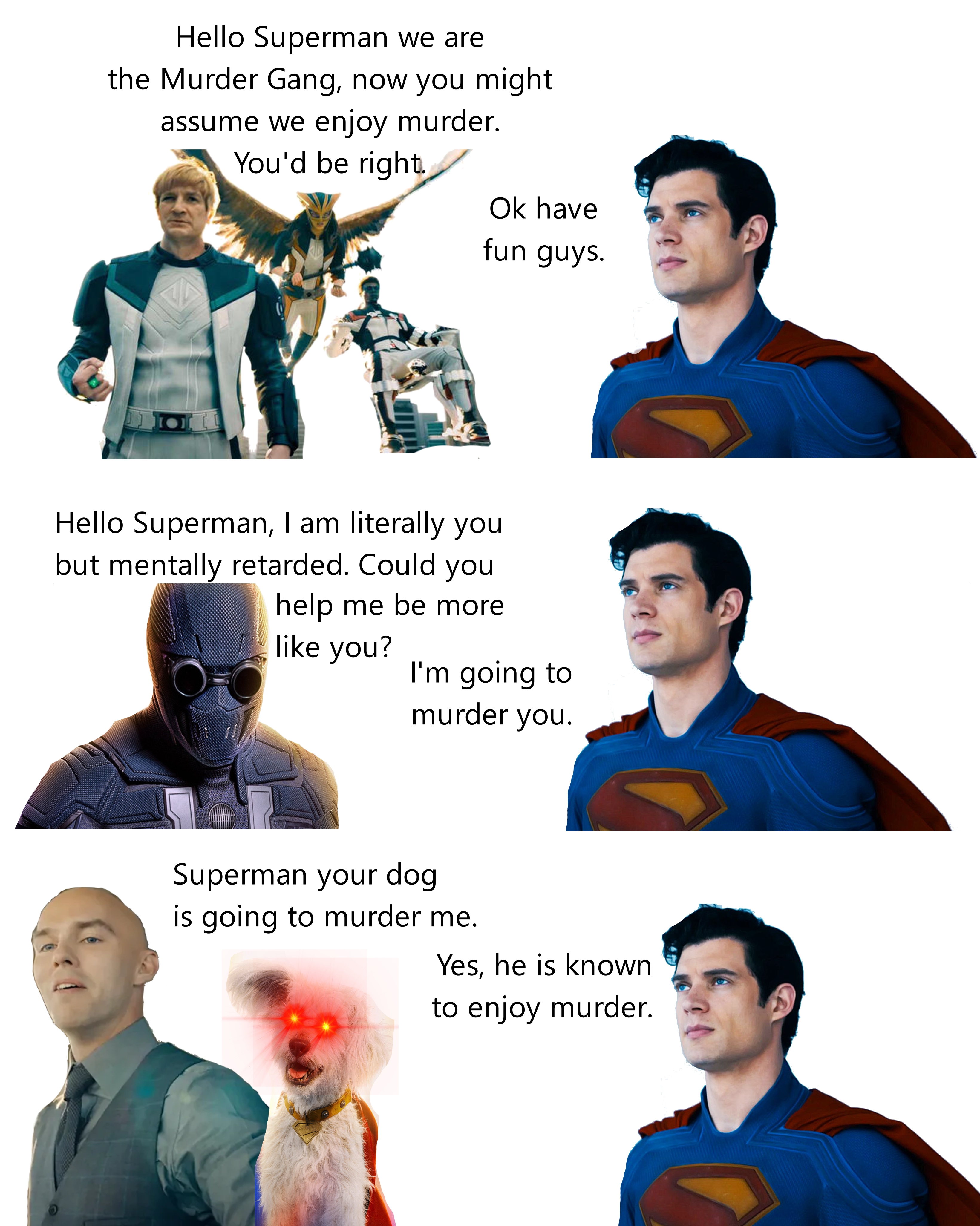 >The Superman we all know and love!!11!!Let's his super powered dog harass and mutilate humansCries over mean tweetsPrioritizes squirrels amidst immense destruction and dangerCan't see Lex is issuing commands to Ultraman when they're literally 10 meters apartTortures leaders of sovereign nations and lets his buddies kill themCan't do anything on his own, needs either his dog or Justice Gang to bust his ass out every time