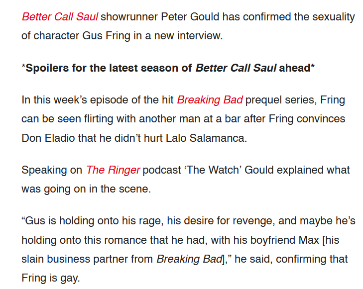 >>219204420GUS IS STRAIGHT! For real tho it's weird how they had the opportunity to outright confirm his sexuality in BCS and just didn't. The most that happens is he gets called a fag a couple times. That guy who dies by the pool was just his friend.