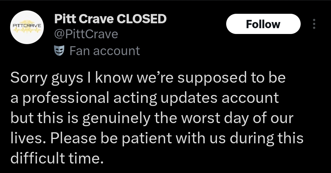 >>219250223Lol this one tweet in the pitt fandom went viral speculating that robby's misogyny wasn't written on purpose and that noah wyle thinks he's writing him as a good person.