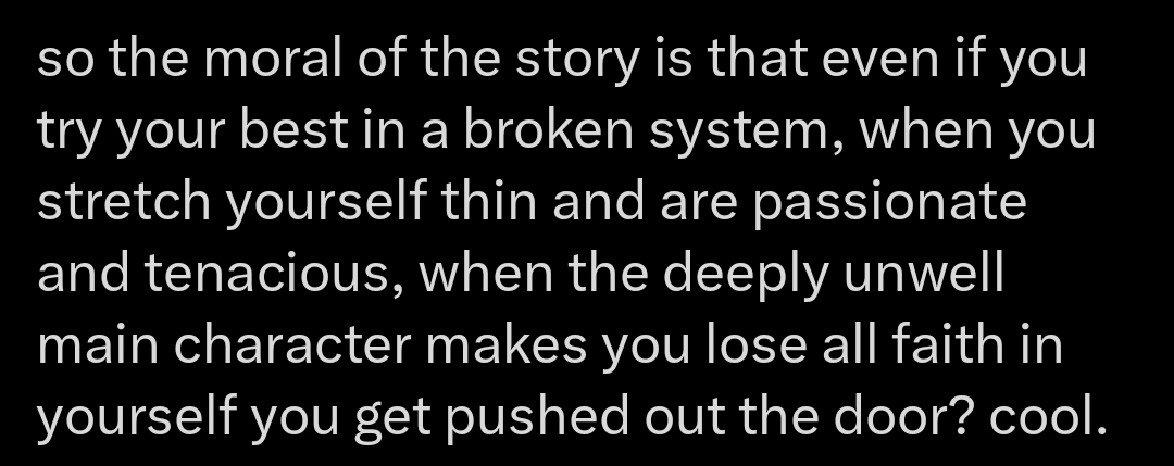 >>219251723>big pharma propaganda>makes explicit that the system is broken and literally everyone above the level of an ER doctor is part of the problemThe board cunt from Season 1 even dropped a "we are a family"