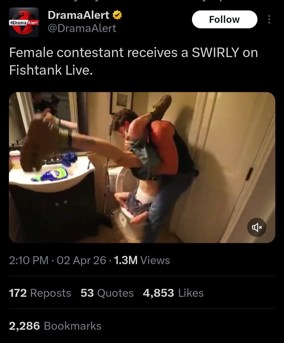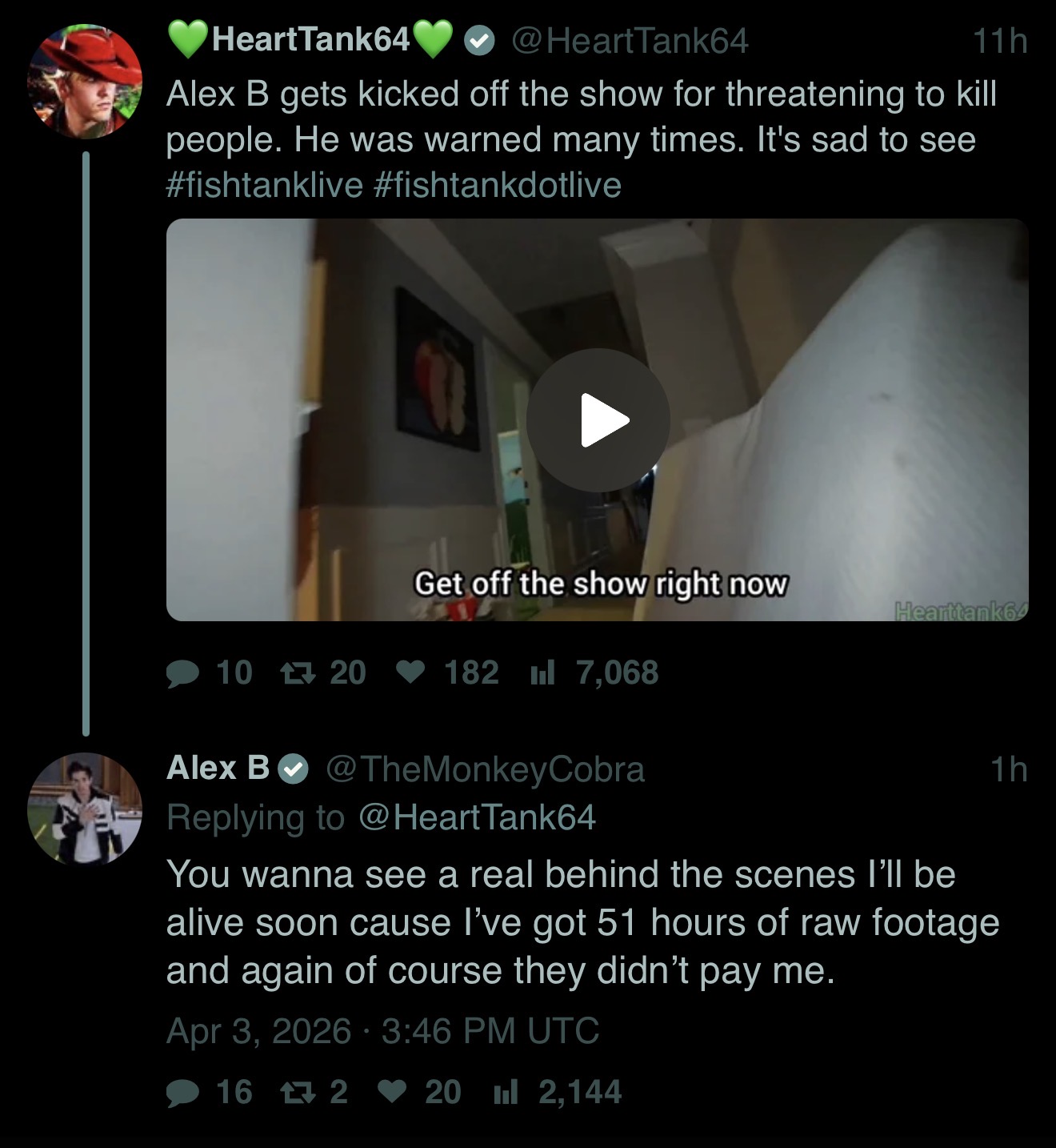>FTL NEWS:-- Alex B is GONE after repeatedly threatening to KILL ppl https://x.com/amorphous714/status/2039945869466980786-- They showed the goo room to Alex B https://www.youtube.com/watch?v=ytEG8qb5OEs -- Fat ghetto Diamond left after 10 minutes. Also she was on Soft White Underbelly as a sex addict-- Emma has been eliminated-- 4 fish remain: James Drake, Landon, The Twins and Bashir>Links:https://fishtank.rip/https://www.fishtank.livehttps://kick.com/fishtankhttps://fishtank.observer/https://classic.fishtank.livehttps://x.com/fishtankislivehttps://old.reddit.com/r/fishtanklive/https://www.instagram.com/fishtank.live/https://www.youtube.com/@fishtankislivehttps://fishtanklive.fandom.com/wiki/Fishtanklive_WikiPrevious: >>219282963