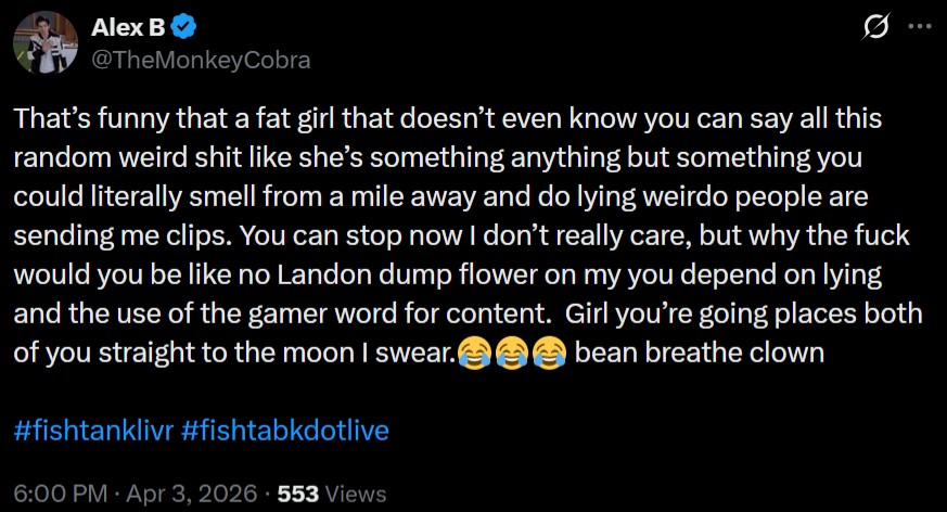 >FTL NEWS:-- Meat Olympics happening NOW for $5,000 (Twins/Bashir/Blane vs. Landon/Drake/Laura/Binx)-- Wiggers blowing the power with George Foreman grills-- NEW SWATTING footage: https://www.youtube.com/watch?v=WBTitlws0HQ -- Frank says Burt is coming on Monday-- Frank: "After 3 seasons I was given the cold shoulder like I'm some random" https://x.com/FrankHassleYT/status/2040214569872720379-- The goo room is OFFLINE>Links:https://fishtank.rip/https://www.fishtank.livehttps://kick.com/fishtankhttps://fishtank.observer/https://classic.fishtank.livehttps://x.com/fishtankislivehttps://old.reddit.com/r/fishtanklive/https://www.instagram.com/fishtank.live/https://www.youtube.com/@fishtankislivehttps://fishtanklive.fandom.com/wiki/Fishtanklive_WikiPrevious: >>219300192