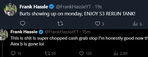 -- Frank: "After 3 seasons I was given the cold shoulder like I'm some random" https://x.com/FrankHassleYT/status/2040214569872720379