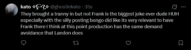 >>219310640bongo wanting to fuck frank is ever more the reason to not bring him on you dumb fucking bitch