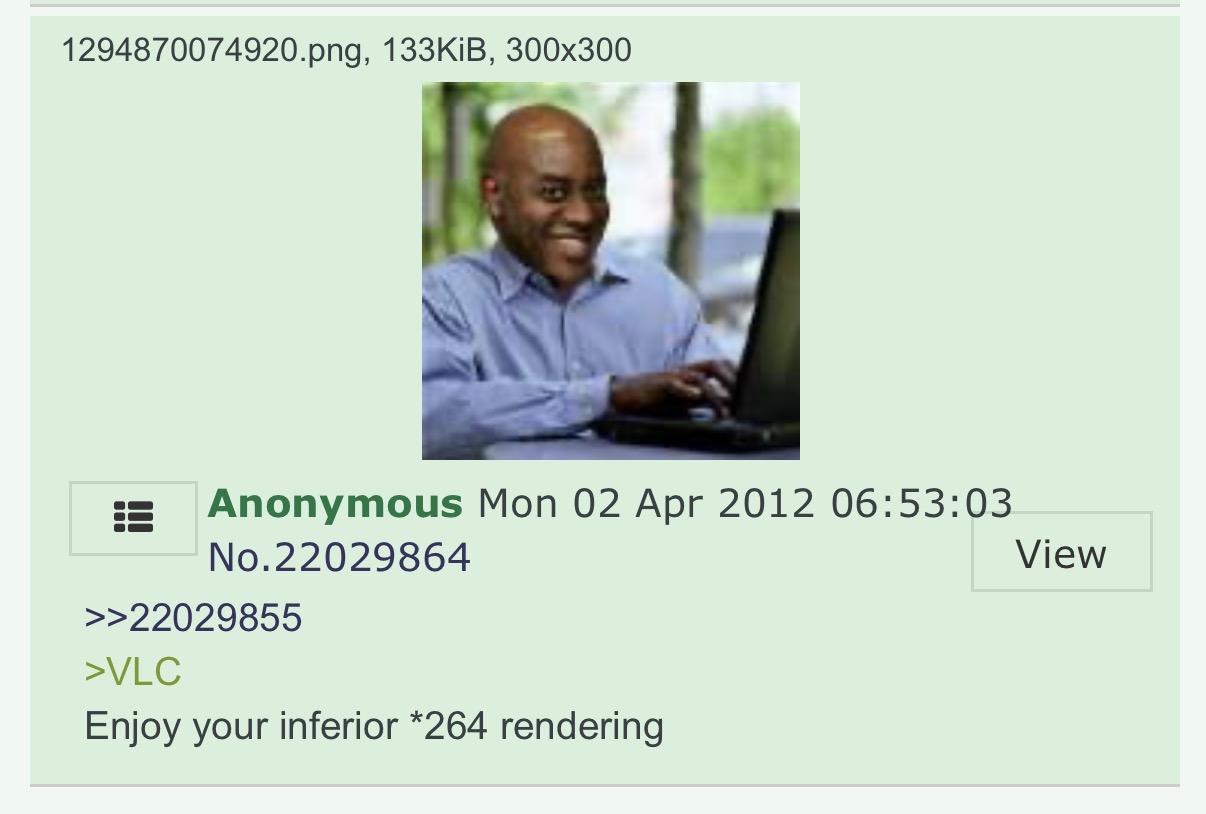 btw here is how I understood it after 10+ years of 4chan: VLC is bad because when you pause and unpause the screen glitches out and you can get funny pictures of artifacted anime girls that way, but that's actually ironically a good thing so it's not bad.