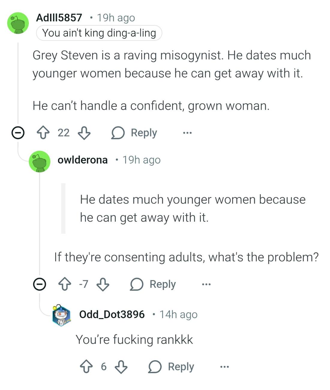>>219322451>by saying they don't know what they're getting into when dating an older partnerIt's a mixture of many retarded reasons, but ultimately it boils down to this; men are NEVER supposed to have "an advantage" in a relationship. Women hate relationships in which men are the "leader" or in a "position of power", yet it's what they truly desire. Women want a man to be a leader. They want a man to be a trusted, confident authority figure. They want to find a man that tells them what to do and they do it.So ultimately what this boils down to is simple. Women are just jealous. They're jealous that """their""" men are being taken from them, despite them probably doing similar things when they were that woman's age. They're angry that men and women DO live different lives. A man can be 40 and be with a woman 5, 10, 15, or even 20 years younger than him, if he can get it, and the men that can get it are usually more attractive men like these multi-millionaire movie stars. It makes them pissed because they realize that men don't value the bullshit lies they were told men value. So they lash out and try to shame men into desiring them over a hot 20 year old by calling men pedophiles for having sex with a consenting adult.An 18 year old woman is a strong, independent woman that is free to do whatever she wants until she decides of her own free will to date a man older than her. Then she's a poor, immature child that can't ever grasp the consequences of being in a relationship. But she can get railed at a frat party by 100 dudes if she wants, that's fine.