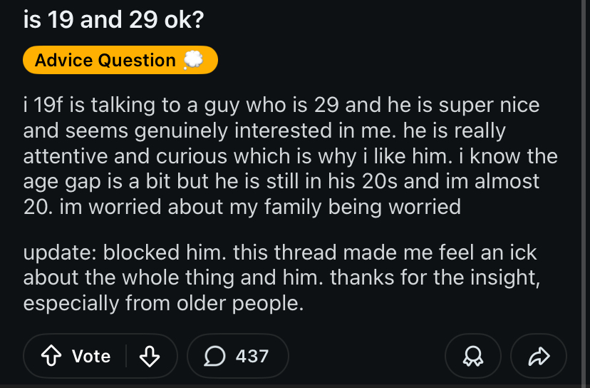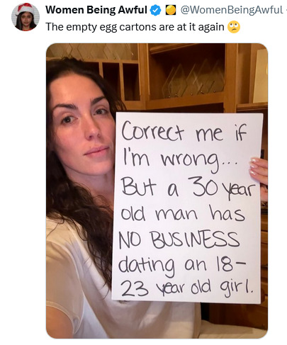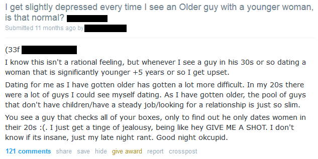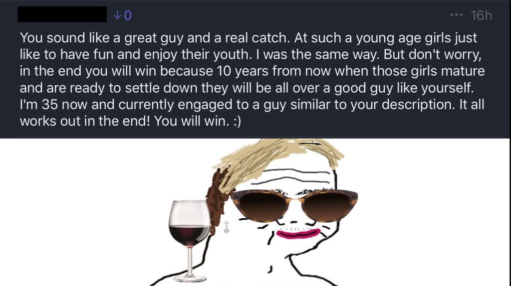 >>219325479The truth is this may be becoming not true. You have to remember women are herd creatures and will follow public opinion. Age gap retardedness is spreading everywhere and it’s gonna have an effect.