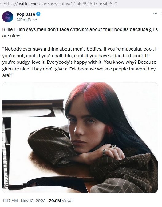>>219330657True, I didn't make that connection. It's mostly because I find Billie really attractive, she's beautiful and her face is just gorgeous, when Irish genes work their magic right, they really make some of the most perfect girls ever known to mankind. Now to defent her a little bit, in the first post she talks about men's bodies, as in too fat, too skinny, or nicely muscular, on the other she talks and judges their facial appearance, which are two different things. She might judge a man based on his face, but not based on his body. But I doubt Billie does that on her personal life, since she's dated some of the ugliest dudes ever. But in the end you are correct ,her arguments are hypocritical.